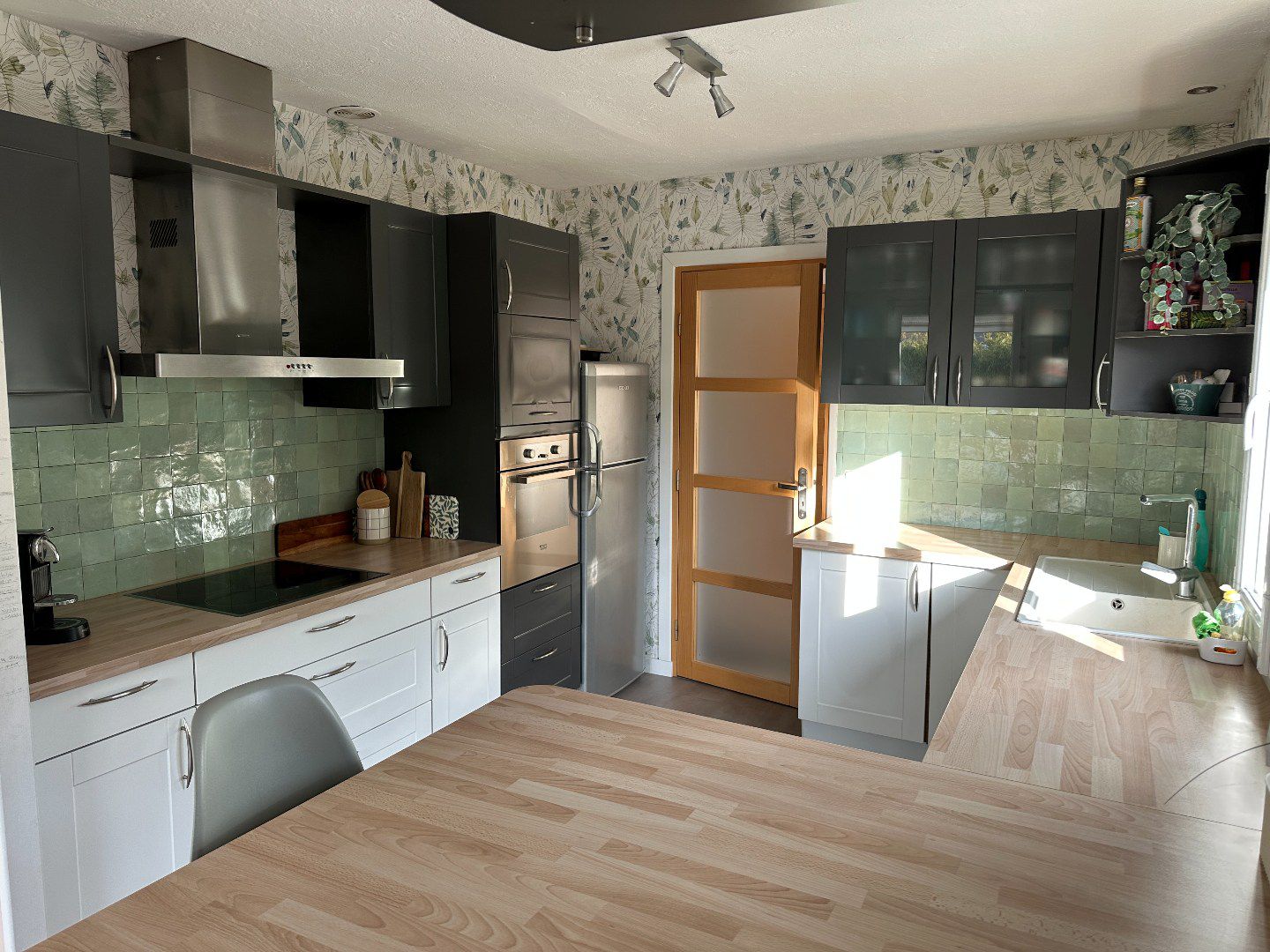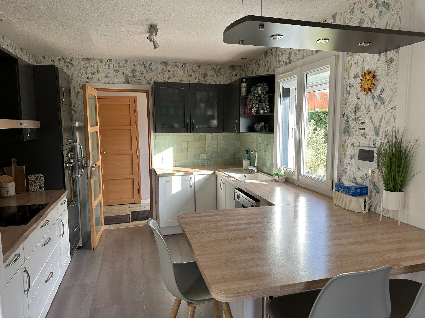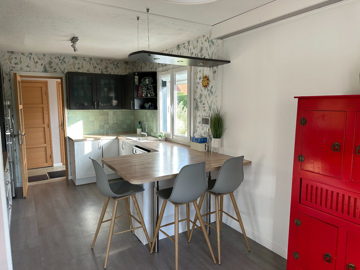 La maison est très fonctionnelle. Elle dispose d'un agréable couloir d'entrée avec rangement, d'un wc avec lave-mains, d'une jolie cuisine équipée spacieuse ouverte sur la salle à manger et le salon.